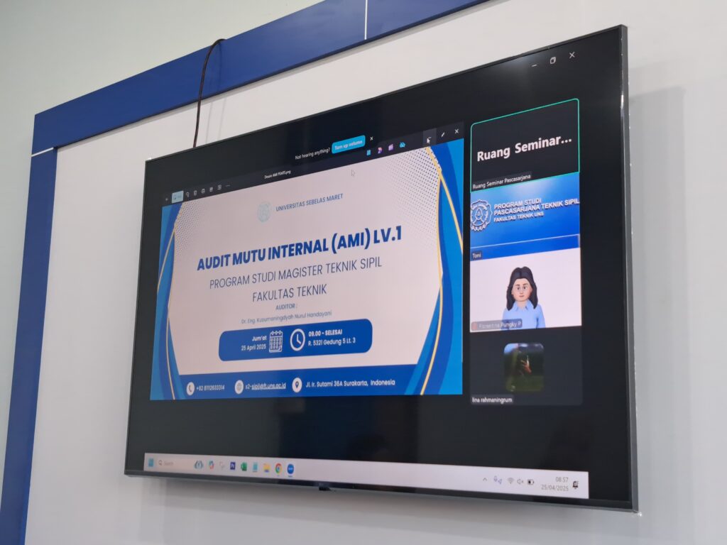 Pada tanggal 25 April 2025, Program Studi Magister Teknik Sipil melaksanakan kegiatan Audit Mutu Internal (AMI) yang bertujuan untuk mengevaluasi ketercapaian standar mutu akademik maupun non-akademik, mengidentifikasi kekuatan dan area yang perlu ditingkatkan, serta memastikan kesesuaian pelaksanaan program dengan dokumen standar mutu yang telah ditetapkan. Kegiatan AMI ini juga menjadi sarana refleksi dan perbaikan berkelanjutan dalam rangka peningkatan kualitas layanan akademik kepada seluruh pemangku kepentingan.