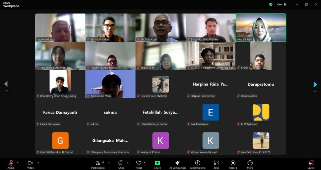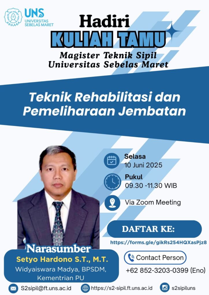 Program Studi Magister Teknik Sipil, Fakultas Teknik, Universitas Sebelas Maret telah menyelenggarakan Kuliah Tamu bertema “Teknik Rehabilitasi dan Pemeliharaan Jembatan” pada Selasa, 10 Juni 2025, yang dilaksanakan secara daring melalui Zoom Meeting. Kegiatan ini menghadirkan Setyo Hardono, S.T., M.T., Widyaiswara Madya pada BPSDM Kementerian Pekerjaan Umum, sebagai narasumber.